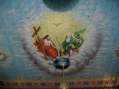 znajduje się ikonostas, który w górnej części ma charakter barokowy i