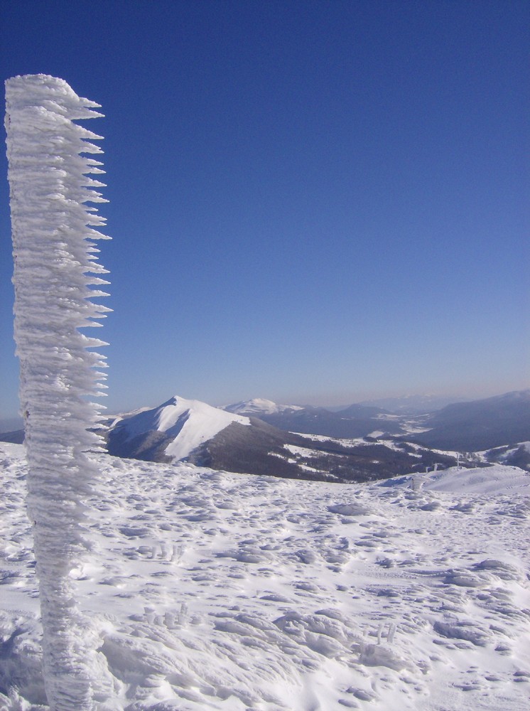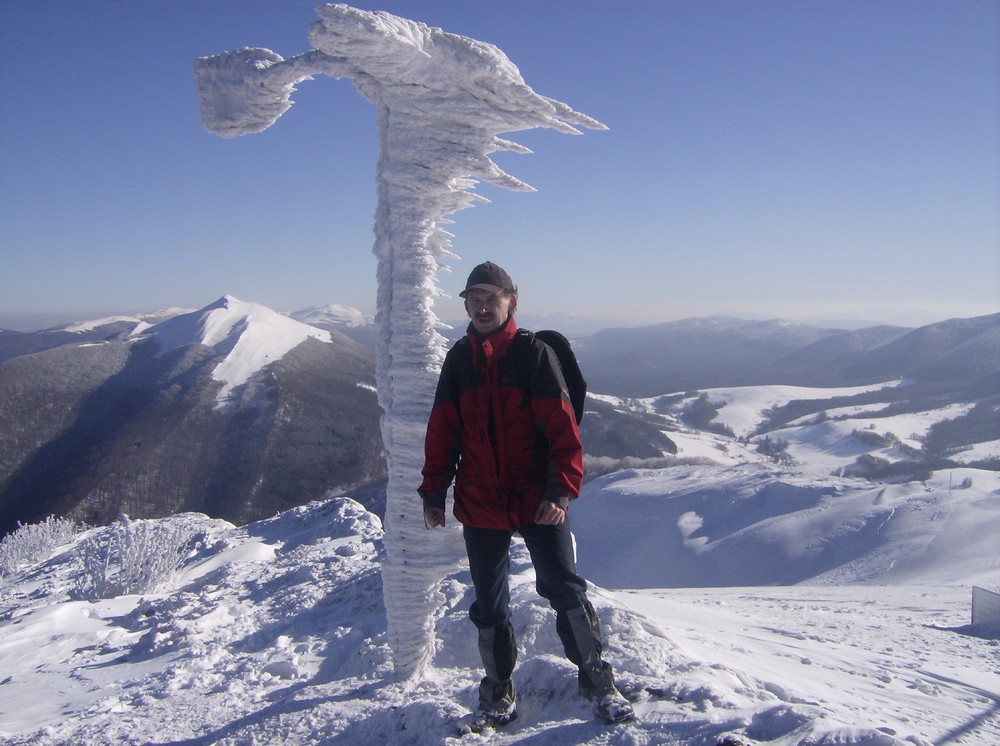 Bociek przy upiornym boćku na tle Połoniny Caryńskiej