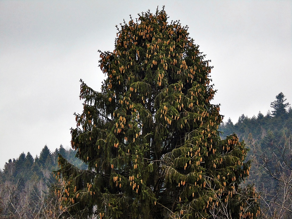Leśniczówka stała między świerkami na pierwszym planie