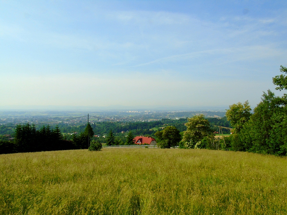 Widok z tarasu Zajazdu na Krosno i Beskid Niski, niestety zamglony