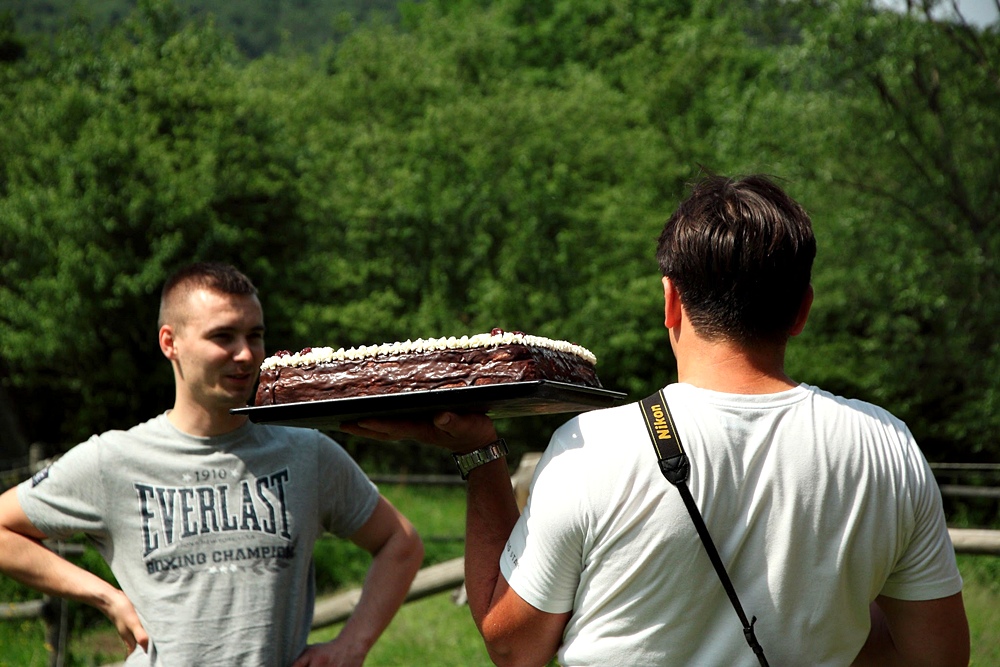 Cas zacząć świętowanie Pan Maciek niesie tort