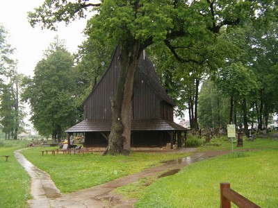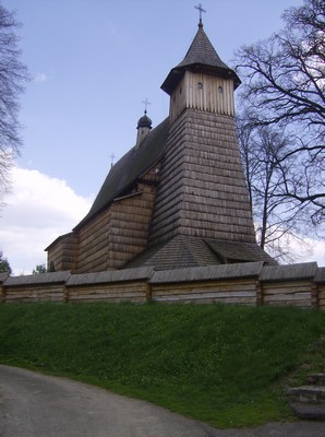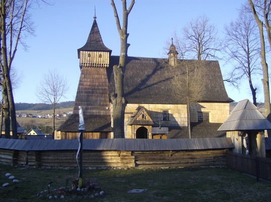 drewniany gotycki kościół konstrukcji zrębowej z wieżą konstrukcji słupowej.