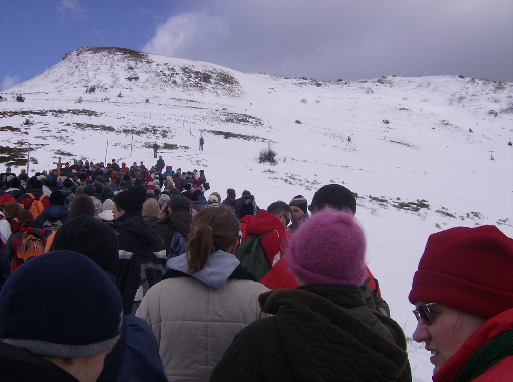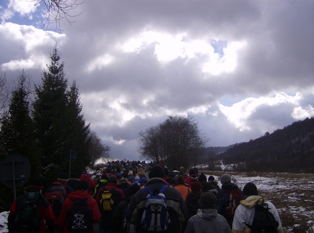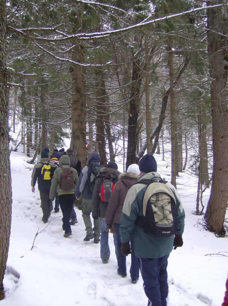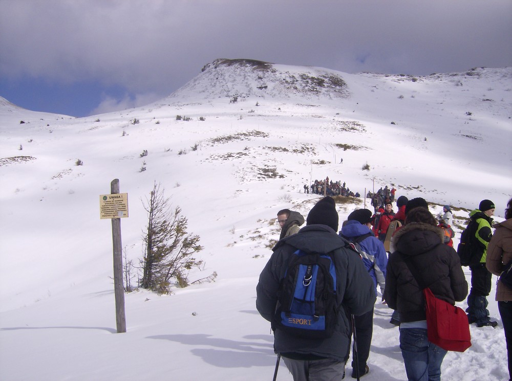 Gęsiego po zmrożonym śniegu na Tarnicę