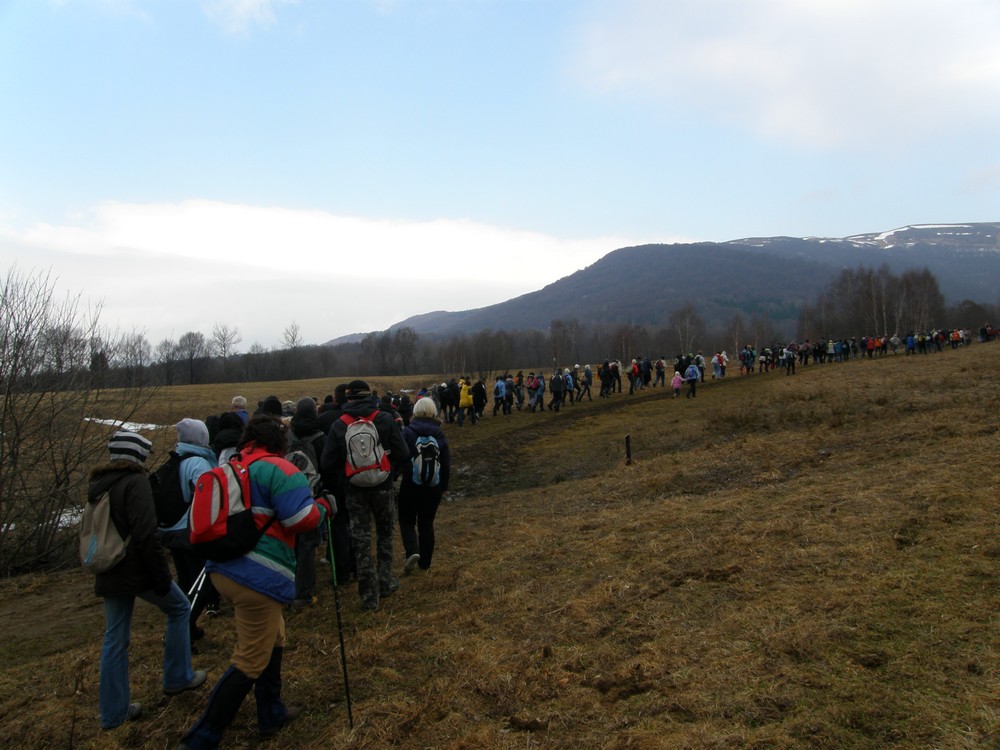 Pierwsza grupa powoli rusza łąkami nad Wołosatem